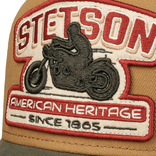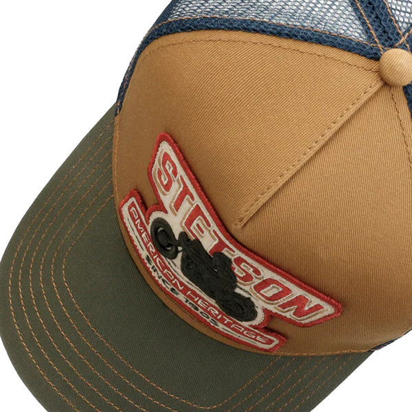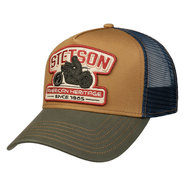 The Biker Trucker Cap looks great in tan, blue and green. The eye-catching motorcycle motif expresses the Stetson brand’s preference for boundless freedom on two wheels. A trendy accessory for highway kings and bikers.
