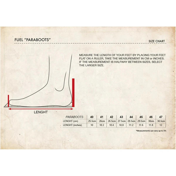 Please see below measurements for guidance or feel free to contact us if you'd like any advice about buying Fuel Para boots online, or confirm stock levels before visiting the shop to try on.