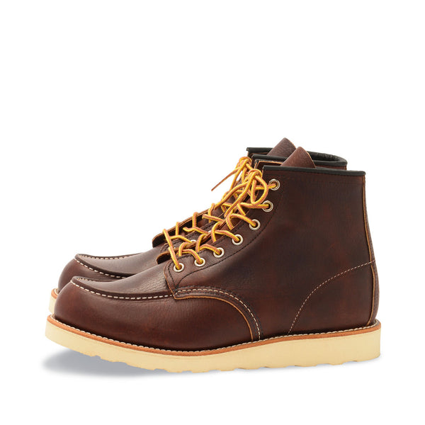 These classic work boots were originally designed and built to cope with the daily rigors down on the farm or in the factory. The minimal tread on the lightweight crepe sole was designed to reduce mud clinging to a farmers boot, while still providing underfoot comfort. The name Moc toe came from the word moccasin, the Algonquian Indian word for shoe. Handmade in Red Wing, Minnesota, USA. These boots will only get better with age. We highly recommend trying these boots on before purchasing online as you will probably have to drop half to a full size in this boot.