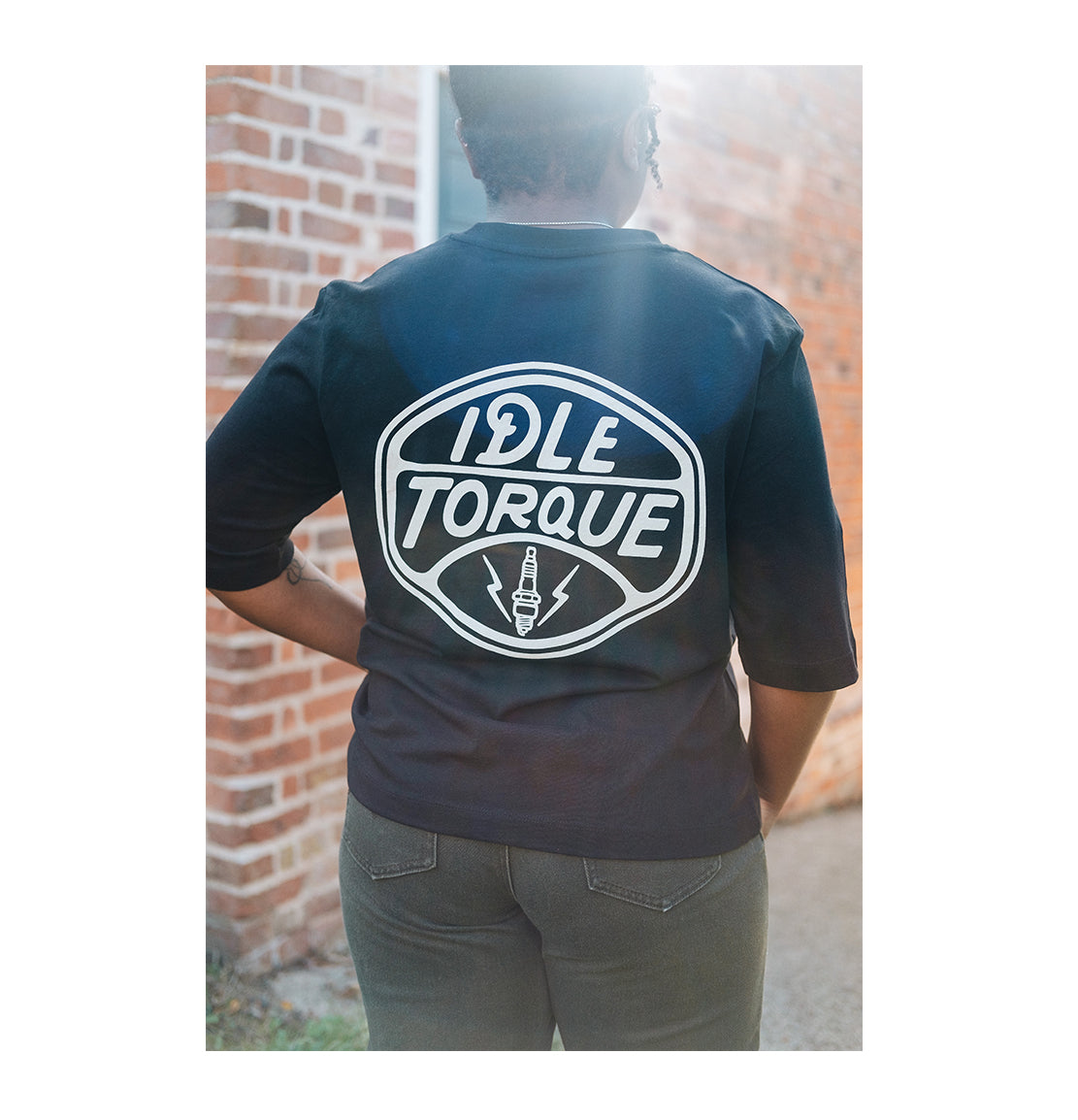 The first Idle Torque Ladies t shirt. This premium tee is made of 100% combed organic cotton and is a boxy fit with elbow length sleeves with small chest print and large back print.