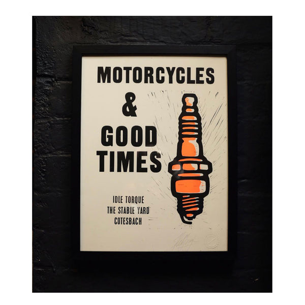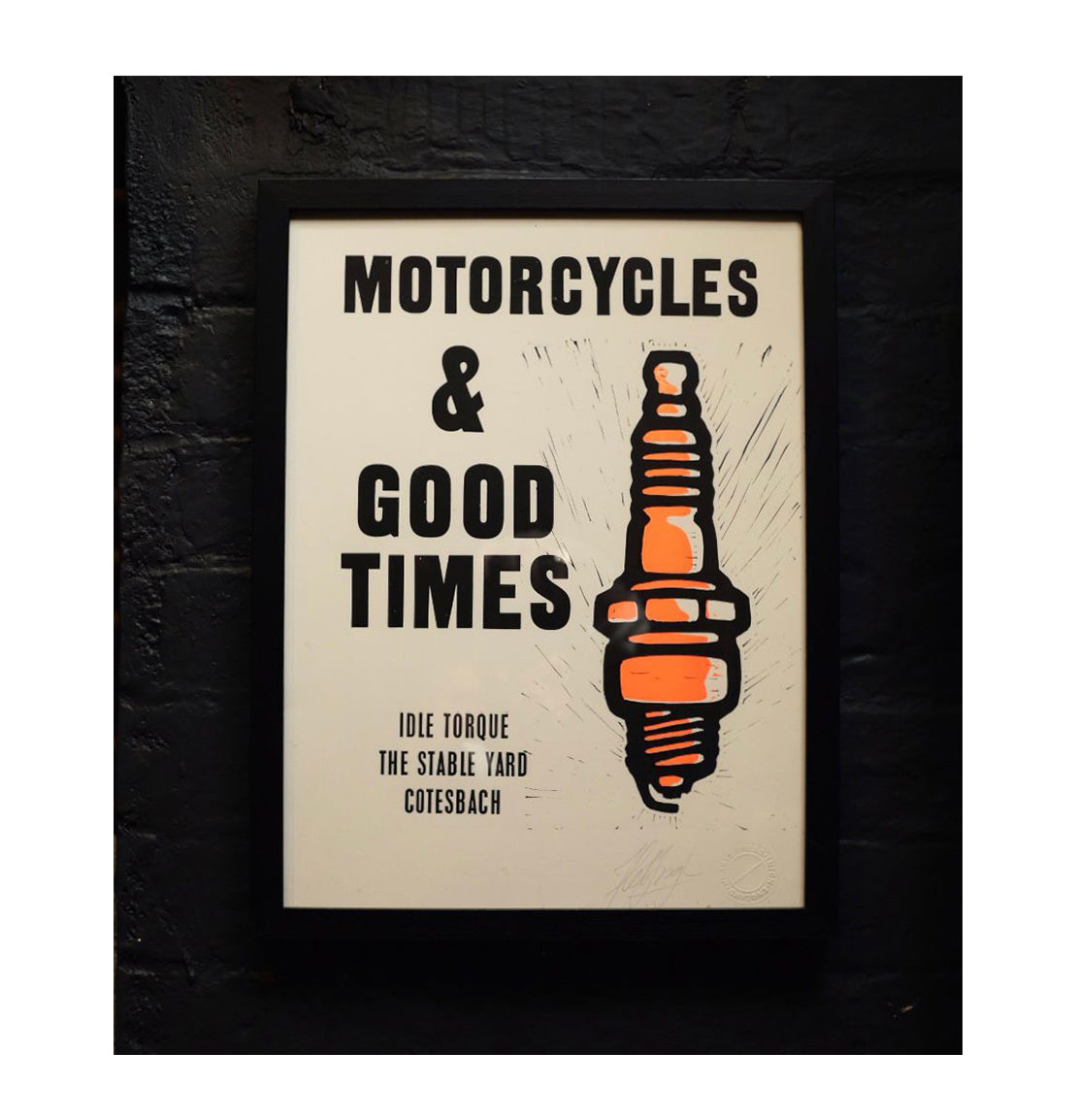 Our good friend, Helen from Hiartzpress produced this awesome A3 print using traditional hand typeset with wood and metal letterpress type and hand-cut linseed Lino block, backed up on scrap wood to create the spark plug and then printed on a 1960s cylinder proof press.