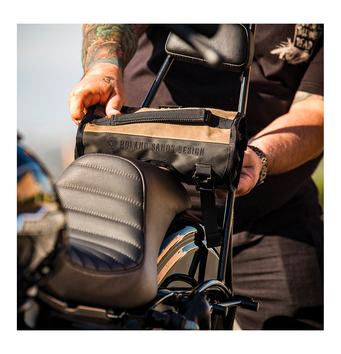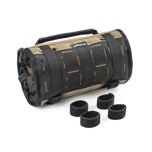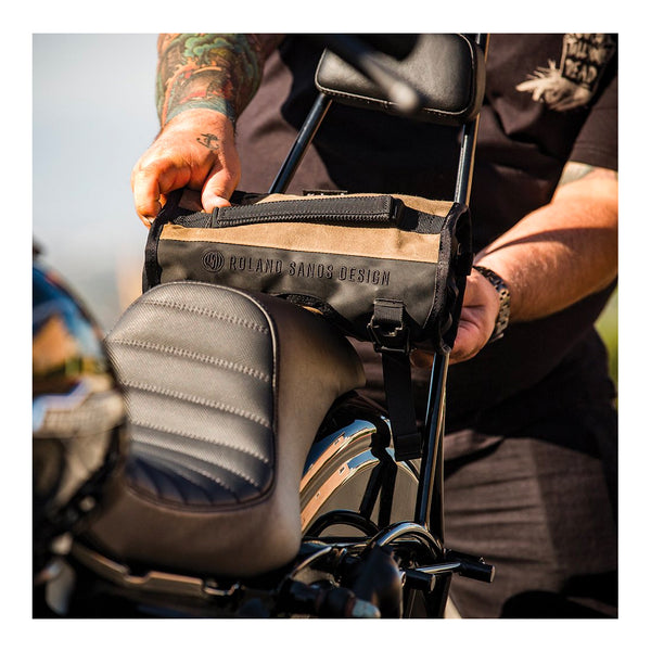The Roland Sands Design X Kriega Roam Tool Roll is an indispensable piece of kit on any road trip. Store in your luggage or mount to the bike with the Velcro® Molle system, it’s a haven for your tools and spares. Constructed from RSD’s propriety wax cotton together with 1000D Cordura® and super tough hypalon reinforcement, the blend of Classic and Modern materials with a technical twist. Unclip and roll-out to reveal four YKK® zip access pockets, 10 elastic loops and a T6 alloy rail with 8 x 3/8" clips for socket management. Additional 1/4” and 1/2” socket rails can also be added. (sold separately)