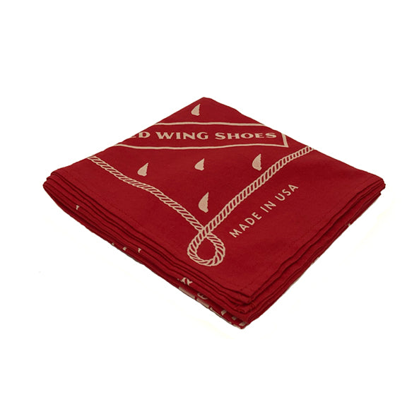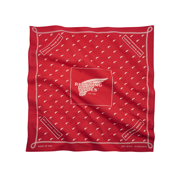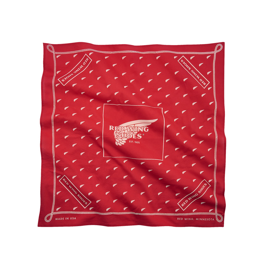 100% Cotton discharge printed center Red Wing Shoes logo bandana with a repeat wing pattern has a soft handfeel and is perfect for your back pocket, or next wearing occasion. Dimensions 18" x 18"