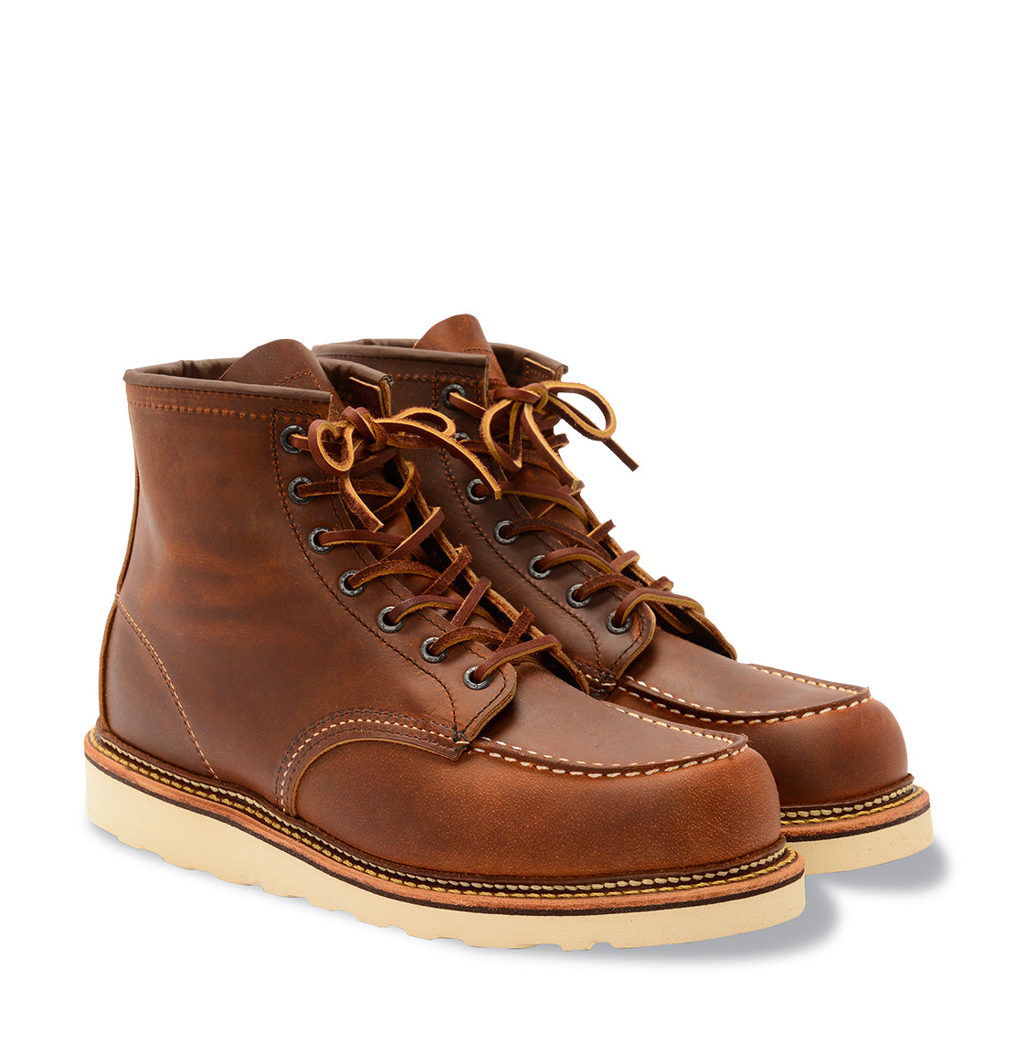 These classic work boots were originally designed and built to cope with the daily rigors down on the farm or in the factory. The minimal tread on the lightweight crepe sole was designed to reduce mud clinging to a farmers boot, while still providing underfoot comfort. The name Moc toe came from the word moccasin, the Algonquian Indian word for shoe. Handmade in Red Wing, Minnesota, USA. These boots will only get better with age. We highly recommend trying these boots on before purchasing online as you will probably have to drop half to a full size in this boot.