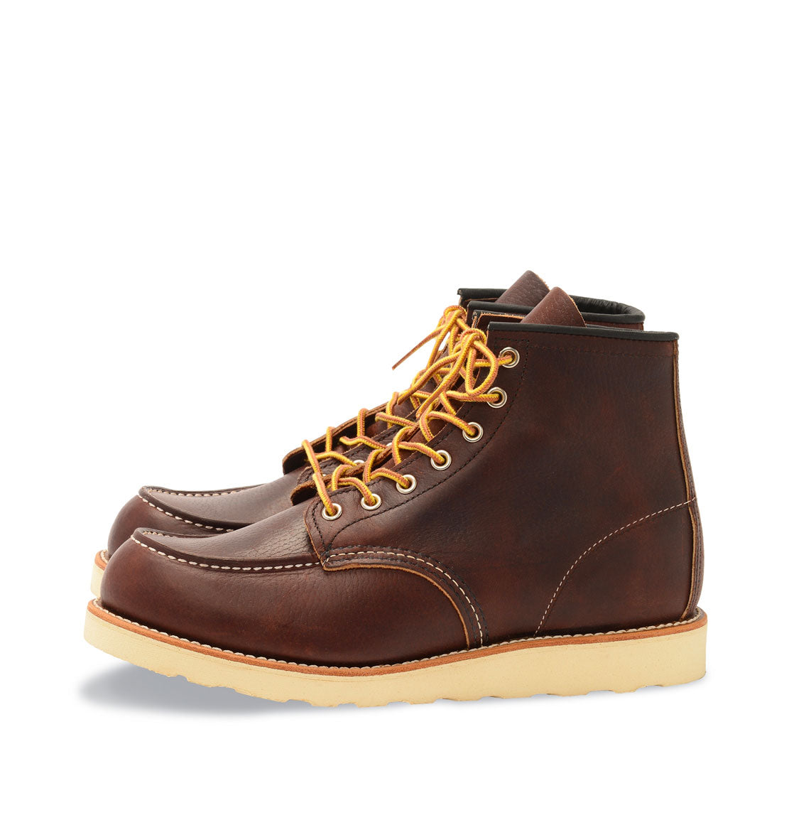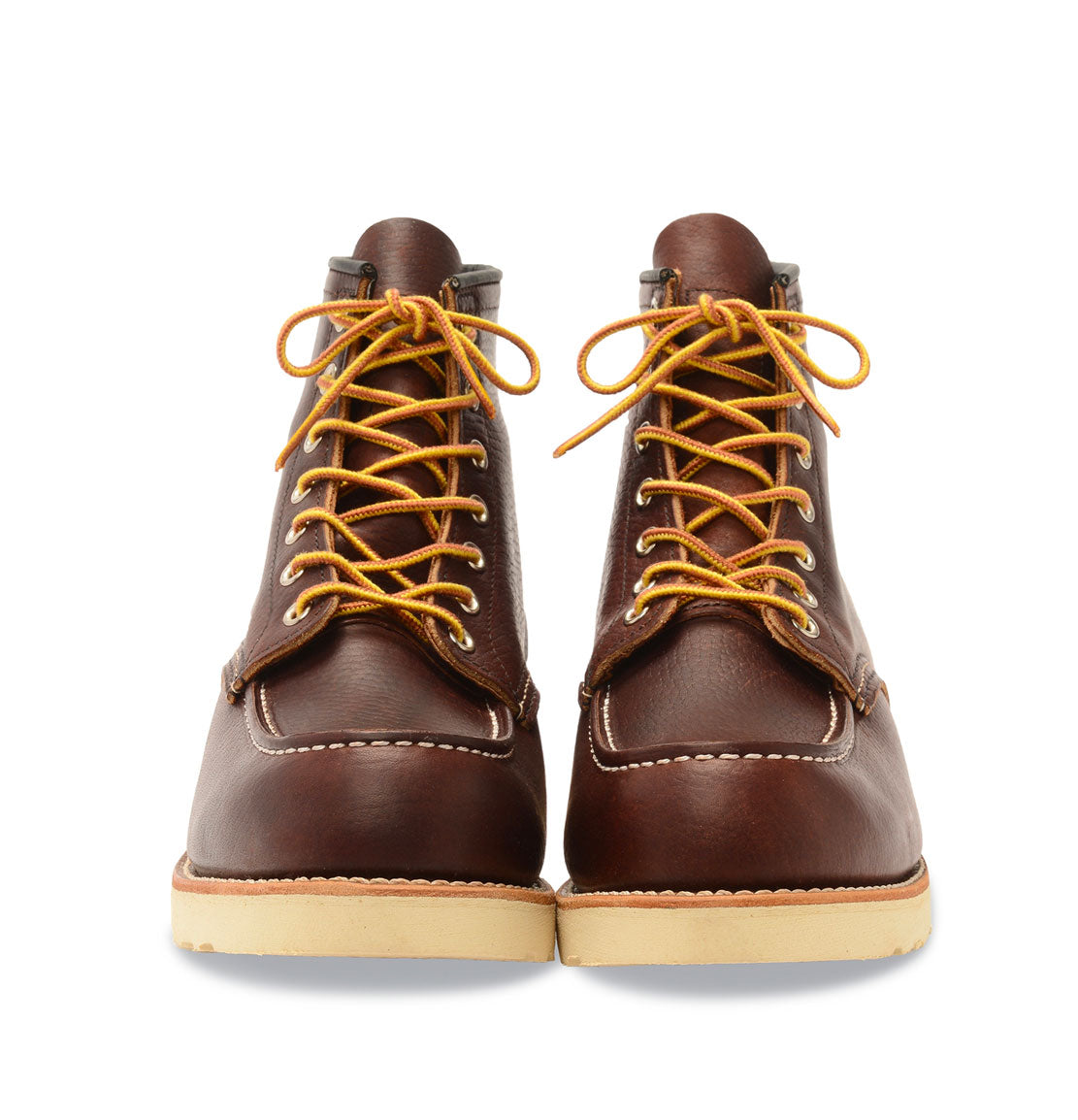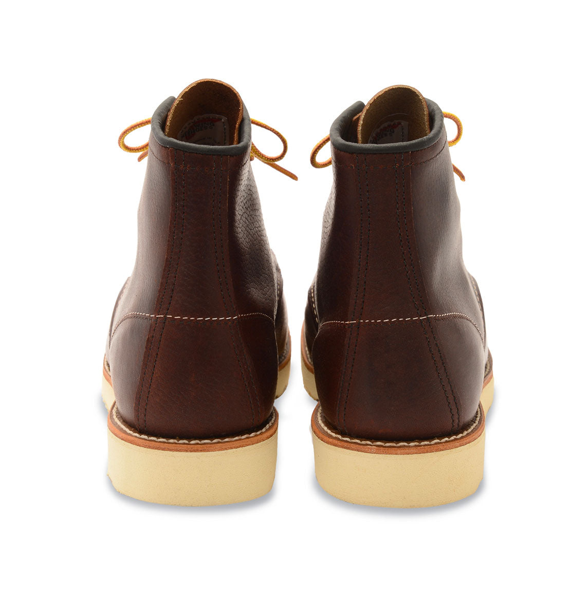 These classic work boots were originally designed and built to cope with the daily rigors down on the farm or in the factory. The minimal tread on the lightweight crepe sole was designed to reduce mud clinging to a farmers boot, while still providing underfoot comfort. The name Moc toe came from the word moccasin, the Algonquian Indian word for shoe. Handmade in Red Wing, Minnesota, USA. These boots will only get better with age. We highly recommend trying these boots on before purchasing online as you will probably have to drop half to a full size in this boot.