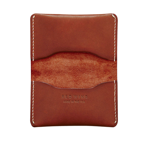 The Red Wing Folded Card Holder in Vegetable tanned leather is a simple piece with a simple, but important job: carry your business or credit cards securely and handsomely. It does both well, thanks to a minimalist construction and the high quality Red Wing Oro-Russet leather is used that will look better with age. One slot for cards in each side fold against each other for superb security yet quick access, making this card holder a reliable companion for years to come. This product is made in the USA.